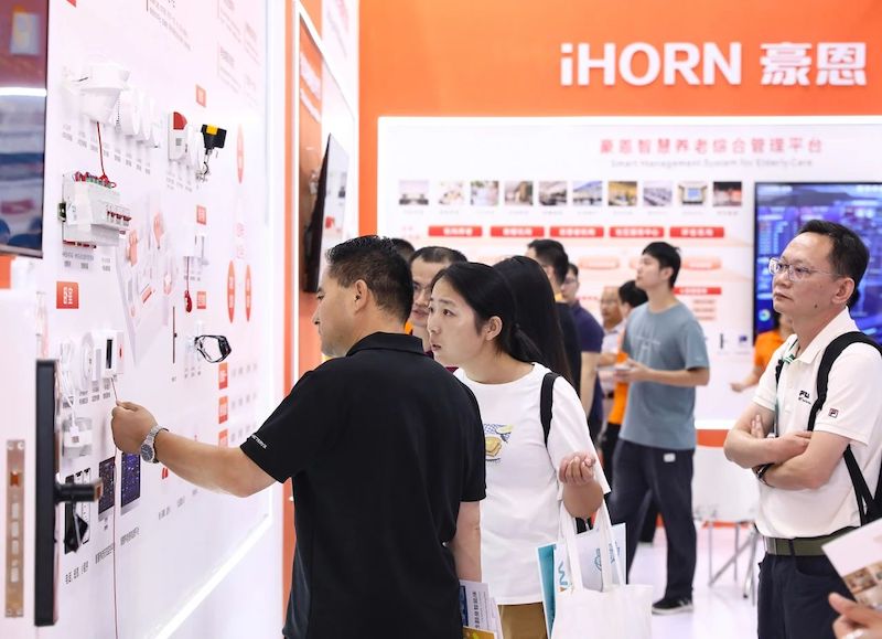 Site, that occupy the home aging system exhibition shows the infrared detector, pull rope emergency button, smoke alarm, gas alarm, intelligent sleep monitoring belt, fall monitoring sensor and other products, provide fire monitoring, gas leakage alarm, health management, fall detection, abnormal alarm, and other functions, implementation from artificial care to the cloud care of intelligent upgrade.