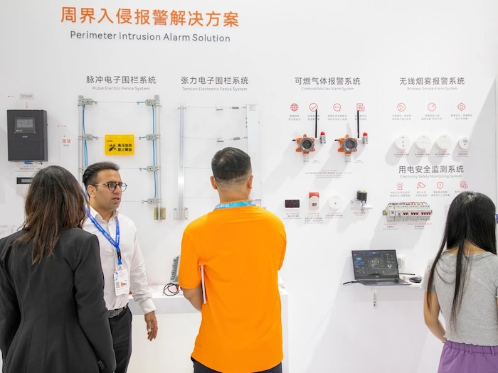 周界入侵報(bào)警解決方案現(xiàn)場(chǎng)展示了脈沖電子圍欄系統(tǒng)和張力式電子圍欄系統(tǒng),由管理軟件、圍欄主機(jī)、控制鍵盤(pán)和前端探測(cè)圍欄組成,報(bào)警功能豐富,具備多種聯(lián)網(wǎng)與對(duì)接方式,系統(tǒng)兼容性強(qiáng),可提升周界安全等級(jí),廣泛應(yīng)用于小區(qū)、學(xué)校、工廠、機(jī)場(chǎng)、醫(yī)院等場(chǎng)所的周界防護(hù)。