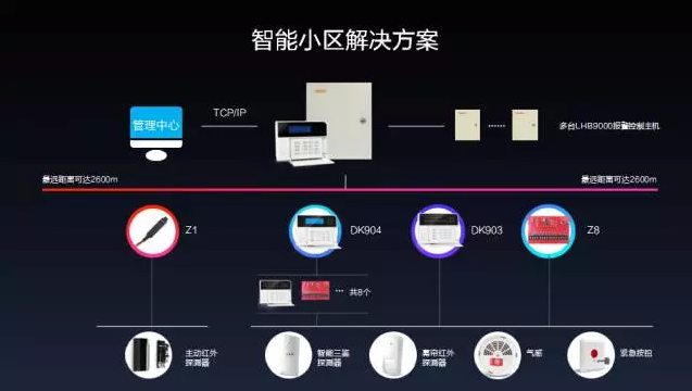 智能小區(qū)解決方案,該方案可通過將主動紅外探測器或者電子圍欄接入到防區(qū)模塊中,以實現(xiàn)對周界的安全防范。普通住宅用戶可通過安裝小區(qū)安裝LCD/LED分區(qū)鍵盤進行單獨控制,別墅安裝LCD分區(qū)鍵盤,在二、三層安裝LED鍵盤來實現(xiàn)二、三層單獨控制,一層通過安裝LCD分區(qū)鍵盤控制家里所有的防盜報警設(shè)備,每個家庭中的分區(qū)鍵盤采用總線的方式統(tǒng)一接入到報警主機中,報警主機通過232串口或光纖的方式將數(shù)據(jù)上傳到管理中心。當(dāng)小區(qū)范圍較大的情況下,增加主機和網(wǎng)絡(luò)模塊,通過TCP/IP網(wǎng)絡(luò)將數(shù)據(jù)上傳到管理中心。