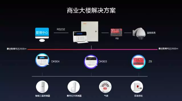 商業(yè)大樓解決方案,商業(yè)大樓的用戶需要各自控制自己的設(shè)備,公共區(qū)域的入侵防范由物業(yè)統(tǒng)一管理。每個商廈用戶安裝一臺LCD分區(qū)鍵盤或者LED分區(qū)鍵盤,控制自己的設(shè)備,在公共區(qū)域使用八防區(qū)擴展模塊將公共區(qū)域連接在一起,由管理中心統(tǒng)一控制。