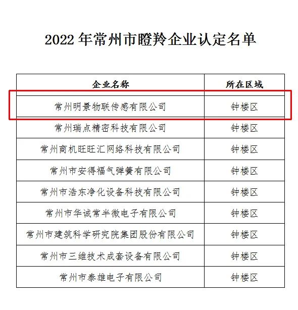 中安科子公司常州明景物聯(lián)傳感有限公司(以下簡稱明景)榜上有名,榮獲“2022年常州市瞪羚企業(yè)”認定。