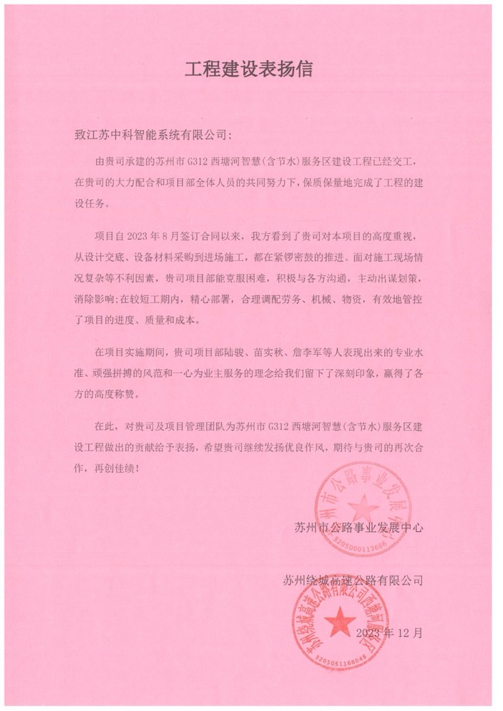近日,蘇州市公路事業(yè)發(fā)展中心和蘇州繞城高速公路給中安科子公司中科智能發(fā)來聯(lián)名表揚信,對中科智能在“蘇州市G312西塘河智慧(含節(jié)水)服務區(qū)建設工程G312-ZHFWQ標段”項目中的整體工作予以認可,尤其是對項目部全體成員在項目實施過程中專業(yè)水準、頑強拼搏的風范和一心為業(yè)主服務的理念表示稱贊。