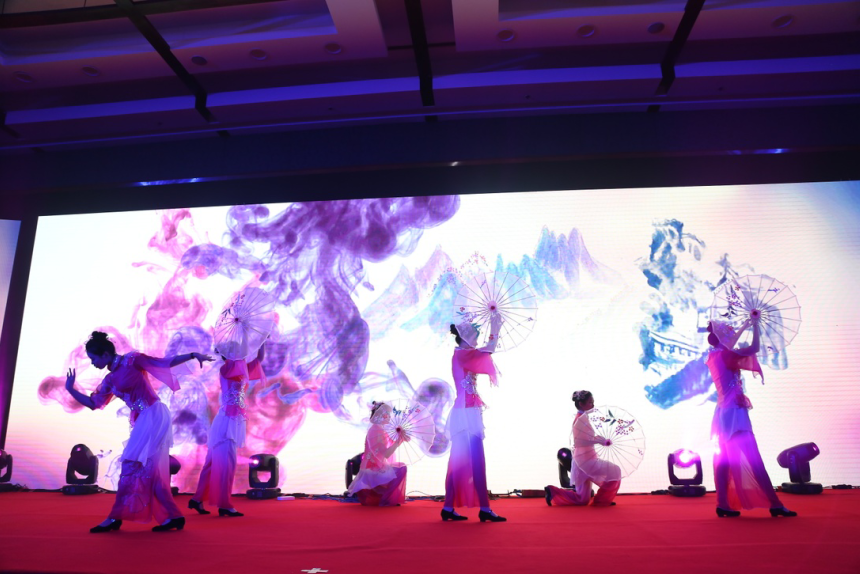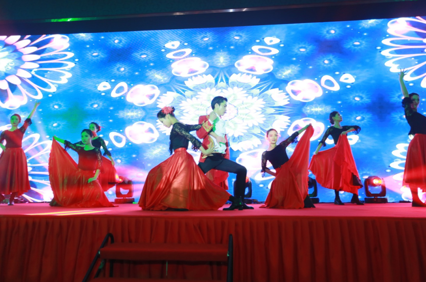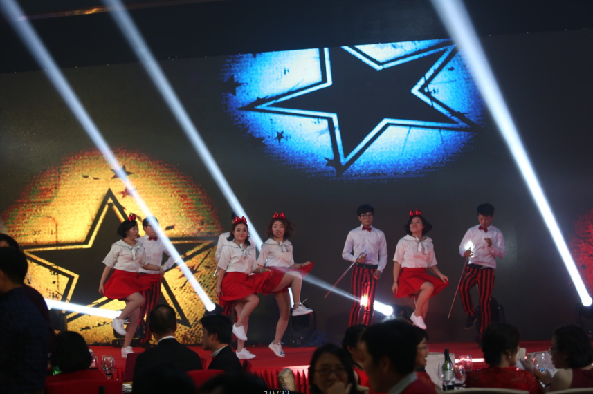 在中安科股份本部的一曲激烈昂揚(yáng)的《斗牛舞》中,晚宴拉開帷幕。8名女郎舞姿干凈利落、紅色裙裾翻飛,男伴氣宇宣揚(yáng),體現(xiàn)了西班牙斗牛士勇往直前的氣概;中安消投資公司的相聲《做啥都要?jiǎng)?chuàng)新》,一逗一捧相得益彰、笑料百出;衛(wèi)安集團(tuán)的《月亮代表我的心》吉他彈唱浪漫滿場;中科智能的創(chuàng)意朗誦《中科星愿》,在黑暗中用星星點(diǎn)點(diǎn)的光斑演繹了動(dòng)人的企業(yè)歷程;華和萬潤的《江南舞:煙花三月》舞姿曼妙婀娜,盡顯江南水鄉(xiāng)的詩意柔情;中安消技術(shù)的歌曲串燒《中安消大家庭》溫情而暖心;上海擎天由兩位才華洋溢的員工家屬小朋友帶來了歡快的尤克里里樂器演奏;常州明景的舞蹈《Darling》俏皮輕快、時(shí)尚動(dòng)感;主持人的《燕尾蝶》獨(dú)唱優(yōu)美動(dòng)聽、爆發(fā)力十足;最后登臺(tái)的《貓步輕俏》,舞者從臺(tái)上舞動(dòng)到臺(tái)下,嗨翻全場。晚會(huì)上還穿插進(jìn)行了豐富有趣的游戲互動(dòng),笑聲不斷、驚喜連連。