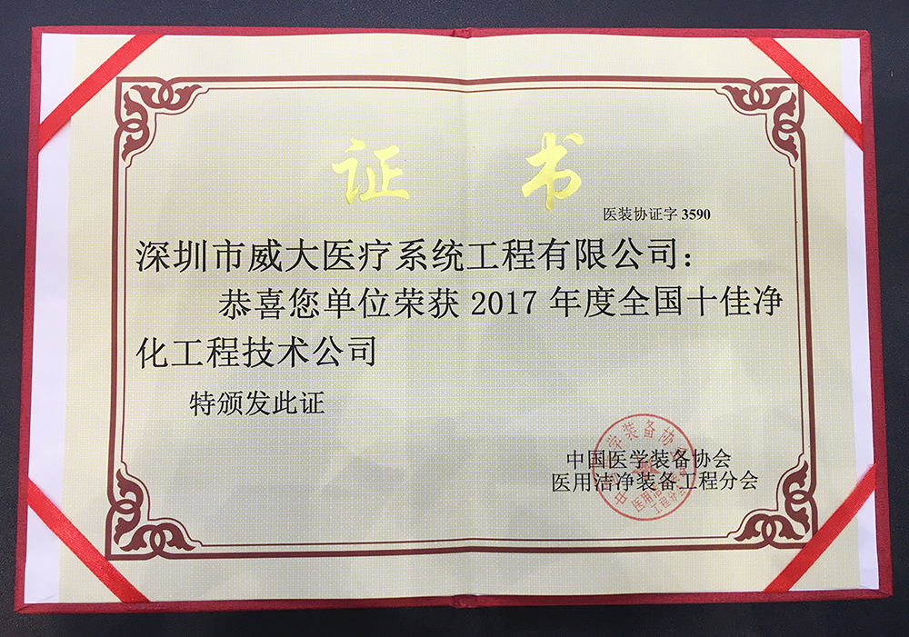 在稍后的頒獎典禮中,深圳威大憑借眾多標(biāo)桿項目的實施經(jīng)驗及豐富的系統(tǒng)集成能力,連續(xù)三年摘得“全國十佳凈化工程技術(shù)公司”的榮譽,并被主辦方授予“醫(yī)用潔凈裝備工程分會理事單位”的稱號。成立至今已有25年的深圳威大,已然成為國內(nèi)綠色智慧醫(yī)院、醫(yī)療凈化系統(tǒng)的代表企業(yè)之一,系國家《醫(yī)用潔凈室應(yīng)用規(guī)范》標(biāo)準(zhǔn)的起草單位、深圳市政府重點扶持的高新技術(shù)企業(yè),擁有多項專利和知識產(chǎn)權(quán),其自主研發(fā)生產(chǎn)的“手術(shù)室控制系統(tǒng)”,已廣泛應(yīng)用于全國各類公共衛(wèi)生及醫(yī)療機(jī)構(gòu)。