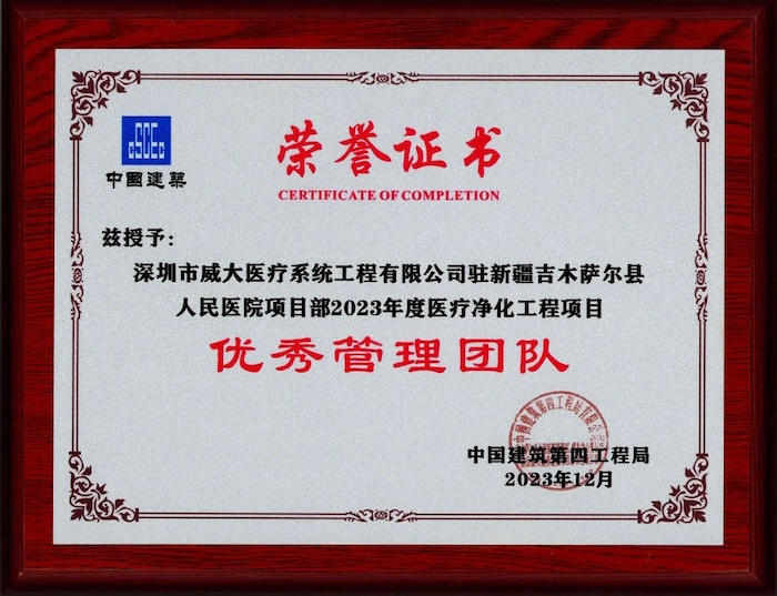 近日,中安科子公司深圳市威大醫(yī)療系統(tǒng)工程有限公司在承建的新疆吉木薩爾縣人民醫(yī)院新建項(xiàng)目?jī)艋こ讨?,被總包單位中?guó)建筑第四工程局授予“優(yōu)秀專業(yè)分包商”的榮譽(yù)稱號(hào);同時(shí),公司駐新疆吉木薩爾縣人民醫(yī)院項(xiàng)目部,也在2023年度醫(yī)療凈化工程項(xiàng)目中,被評(píng)為“優(yōu)秀管理團(tuán)隊(duì)”。