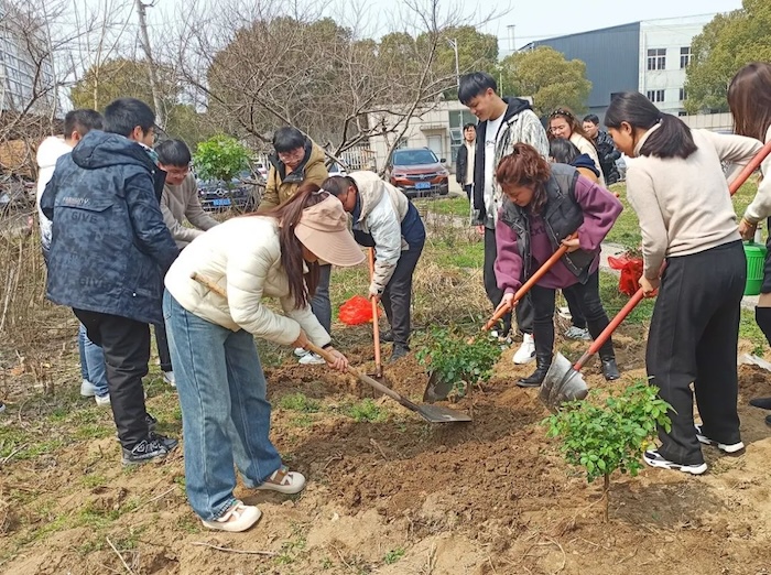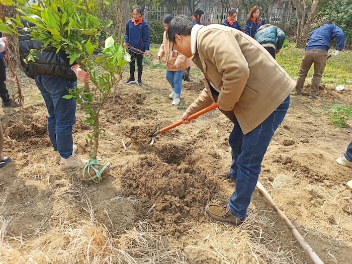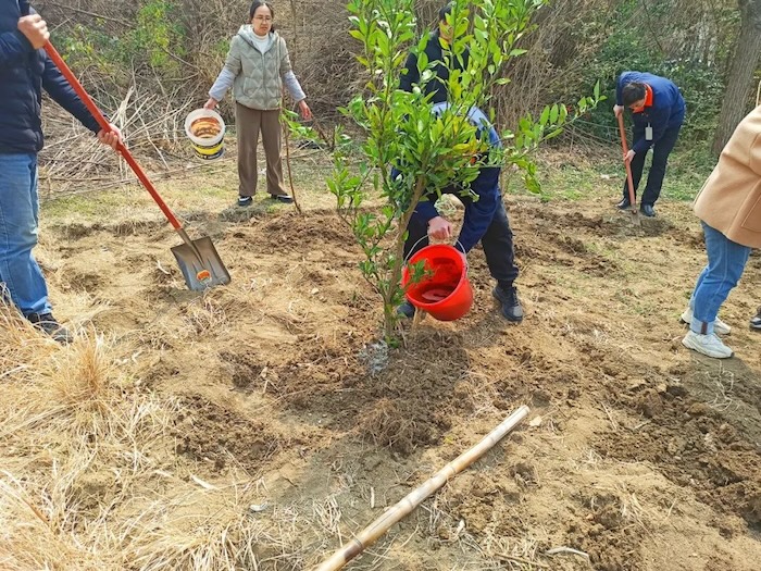在植樹現(xiàn)場,大家干勁十足,分工協(xié)作,有的揮鍬鏟土、有的細(xì)心栽種、有的培土澆水……各個環(huán)節(jié)有條不紊,默契配合。